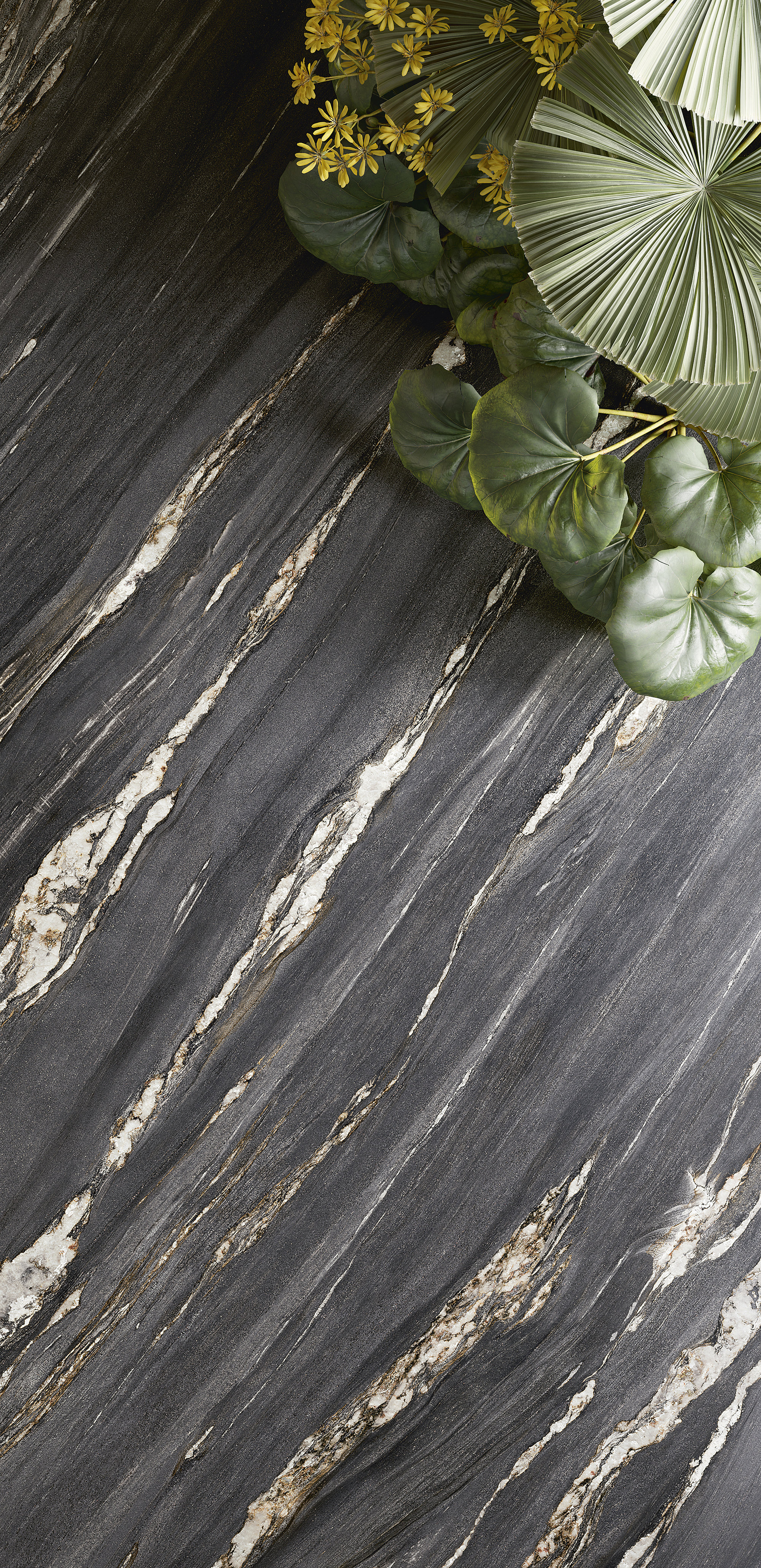 This clear ivory background, both solid and ultra-delicate, is crossed lengthways by an evanescent cascade of bands and stripes: aligned and arranged in a weave of mineral pigments that are thickened and then rarefied, tracing thick pearl-grey grains or deep beige traces.