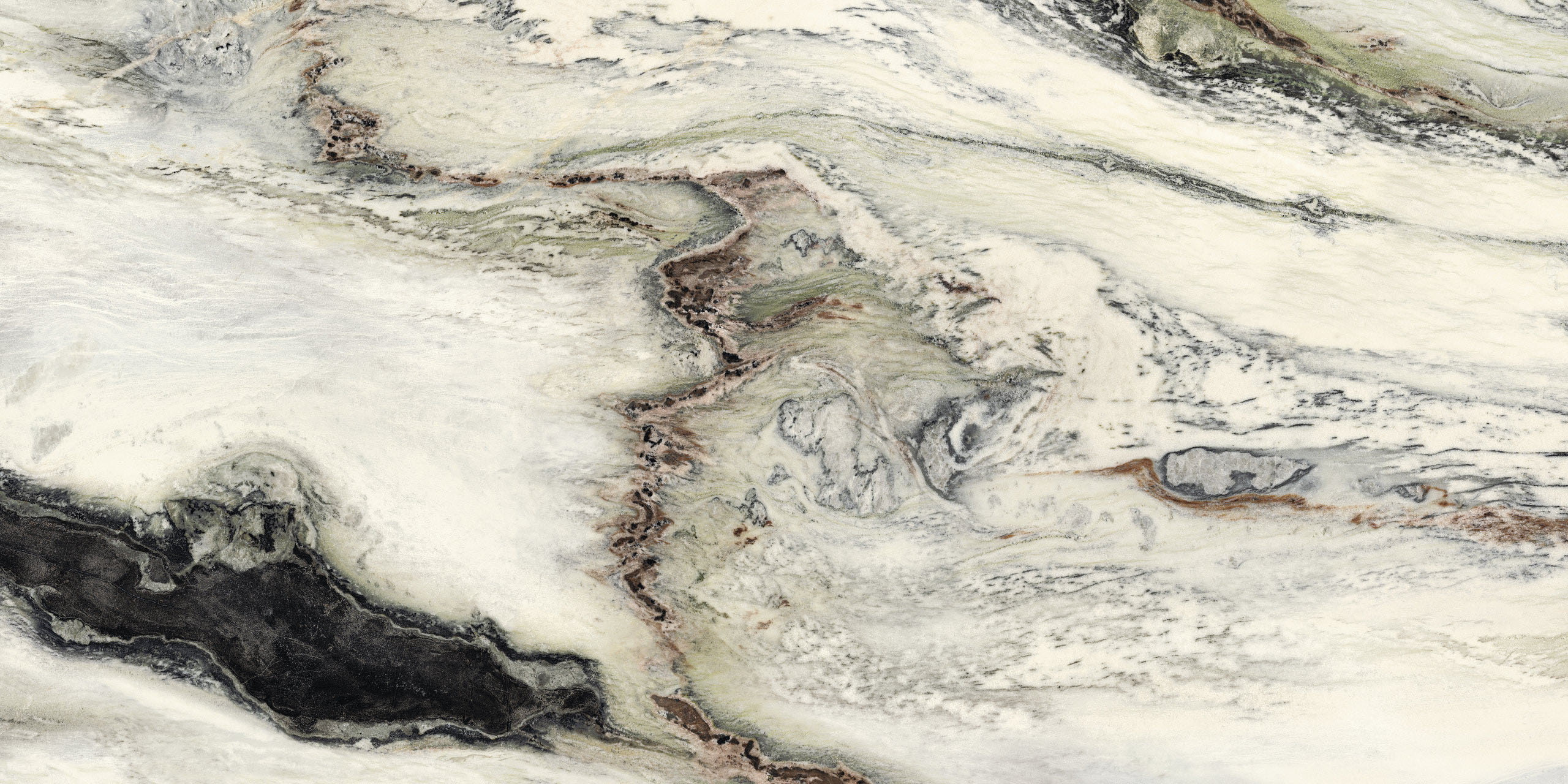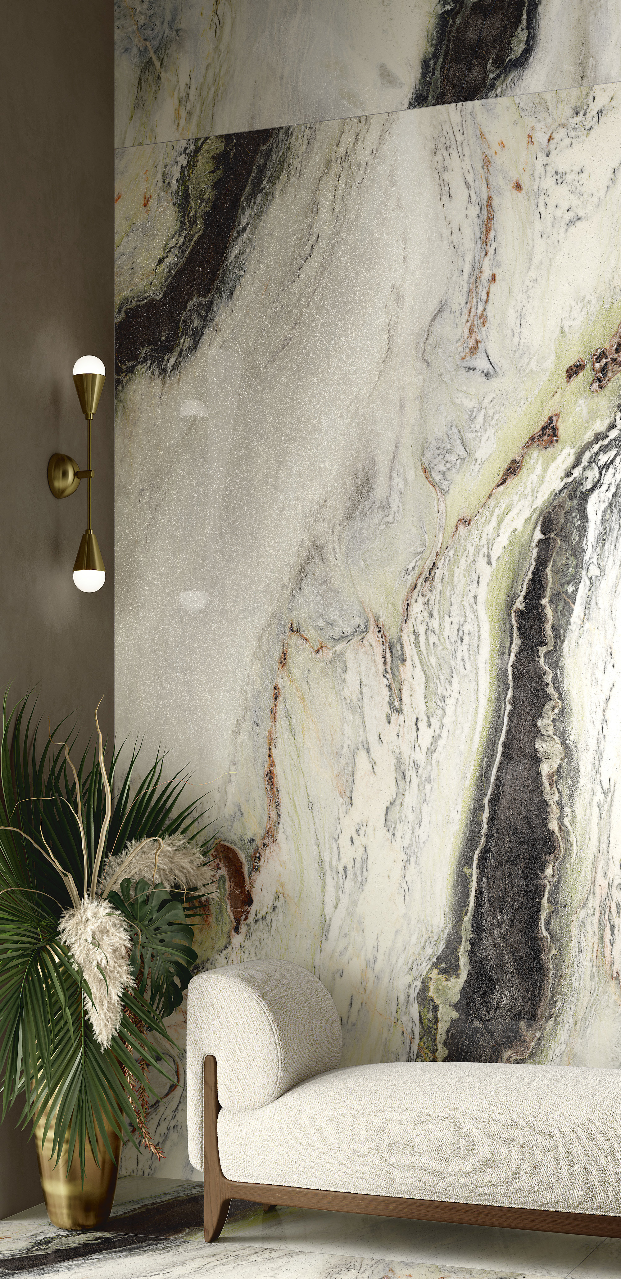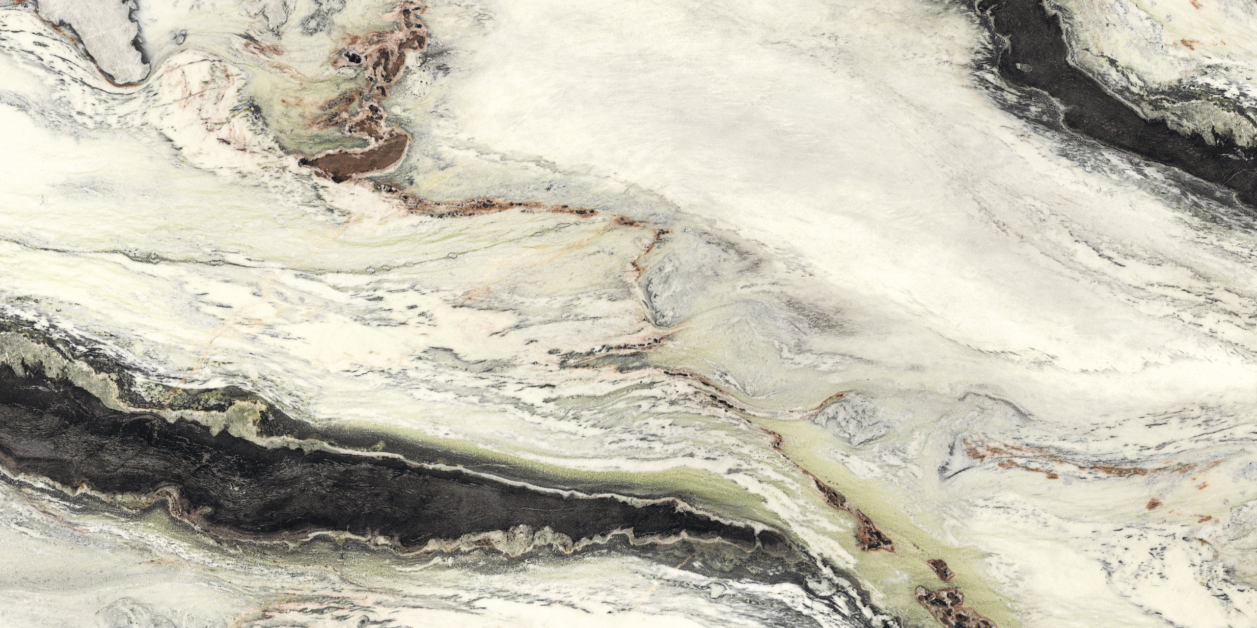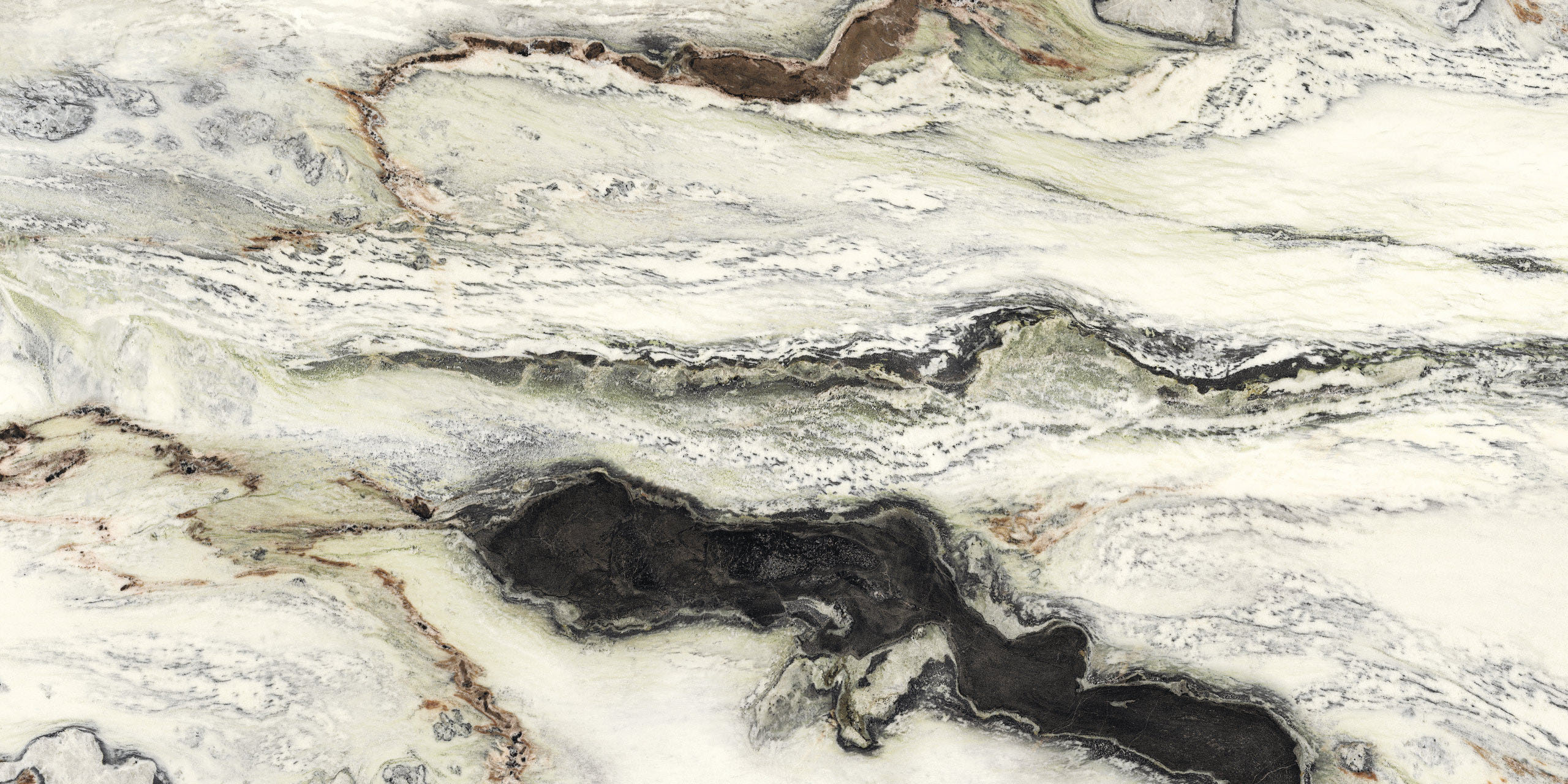 Presents sinuous veins and light ripples that add extra color to the pure white background. The full black tone and its infinite variations create a wave pattern interspersed with soft green and amaranth inserts. The new glint finish emphasizes the color contrast, adding extremely attractive light effects to the polished surface.