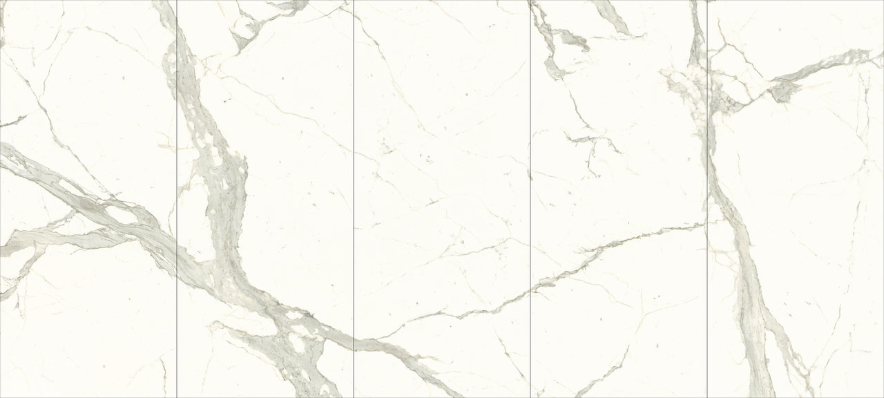 The Pure Calacatta ceramic marble is part of the Maximum color selection, designed to eliminate material waste on-site. The 120x270 cm format, with a 6 mm thickness, was designed to reduce cutting waste while conforming to the minimum height required for habitability.