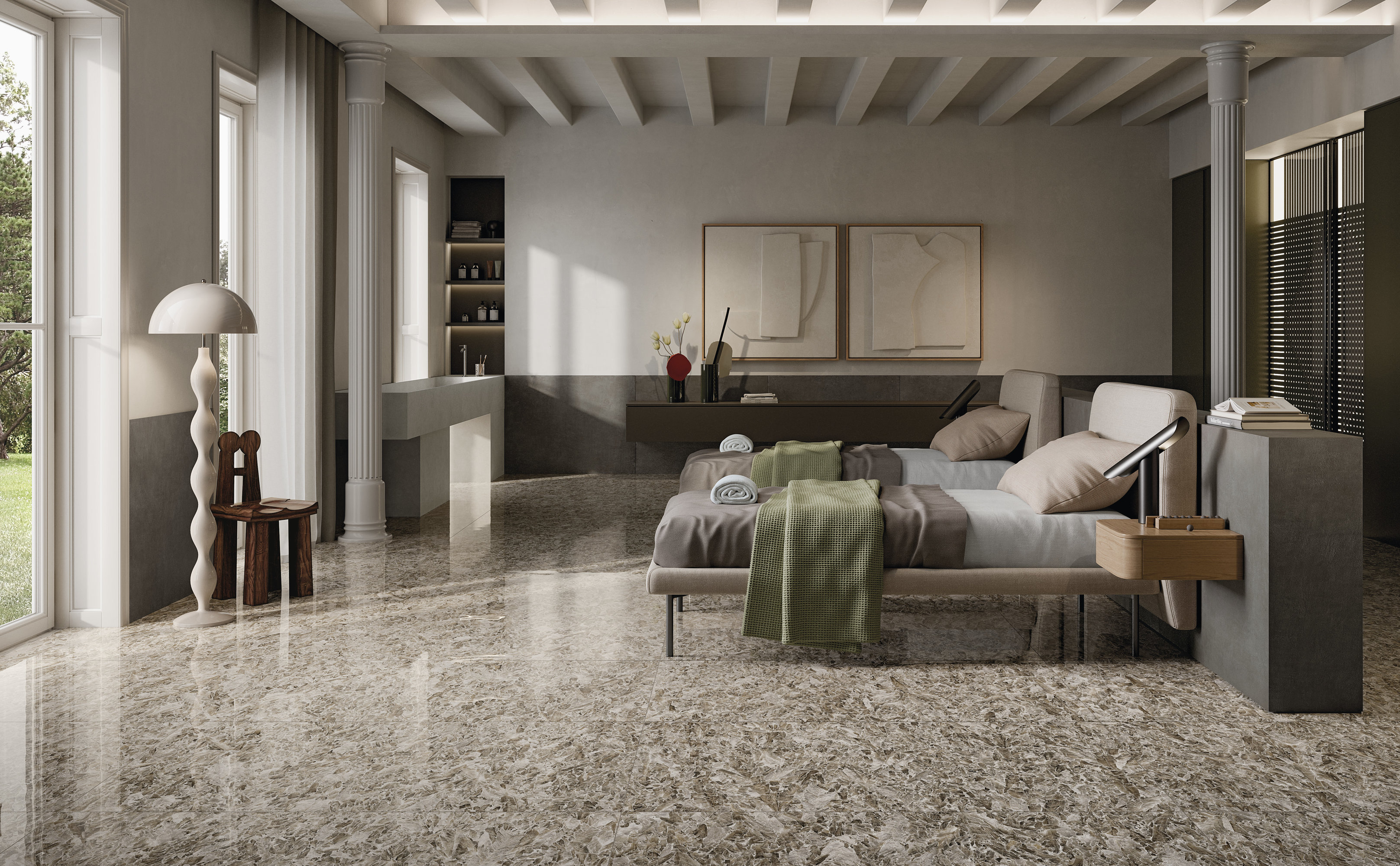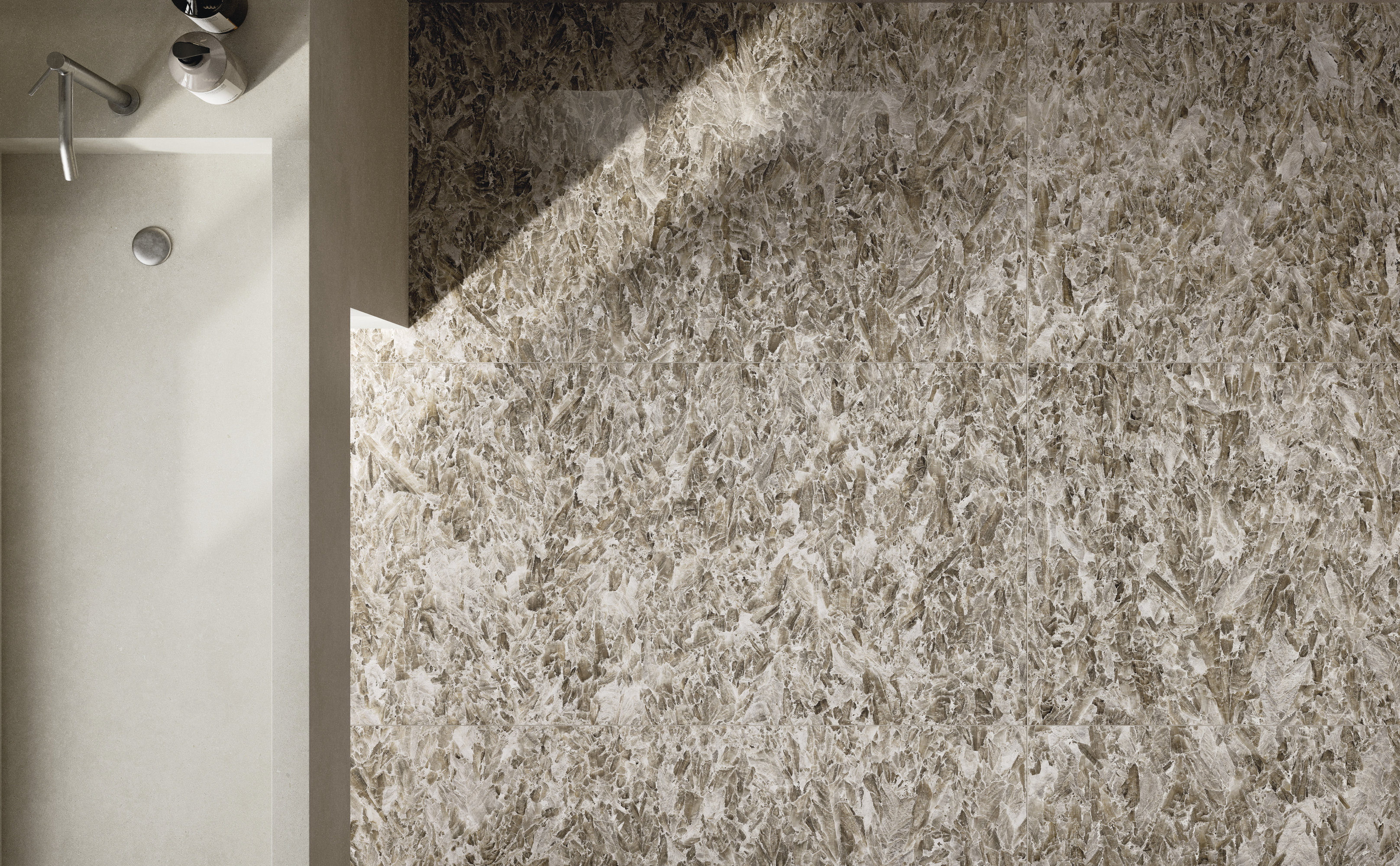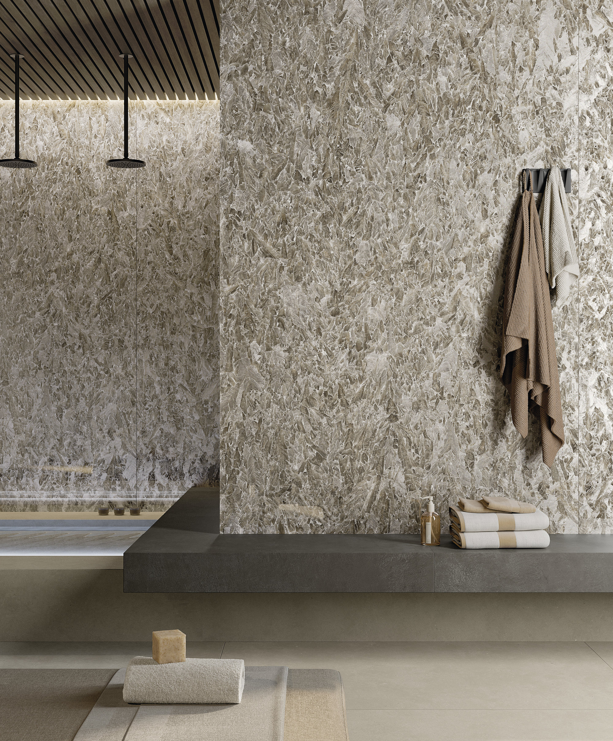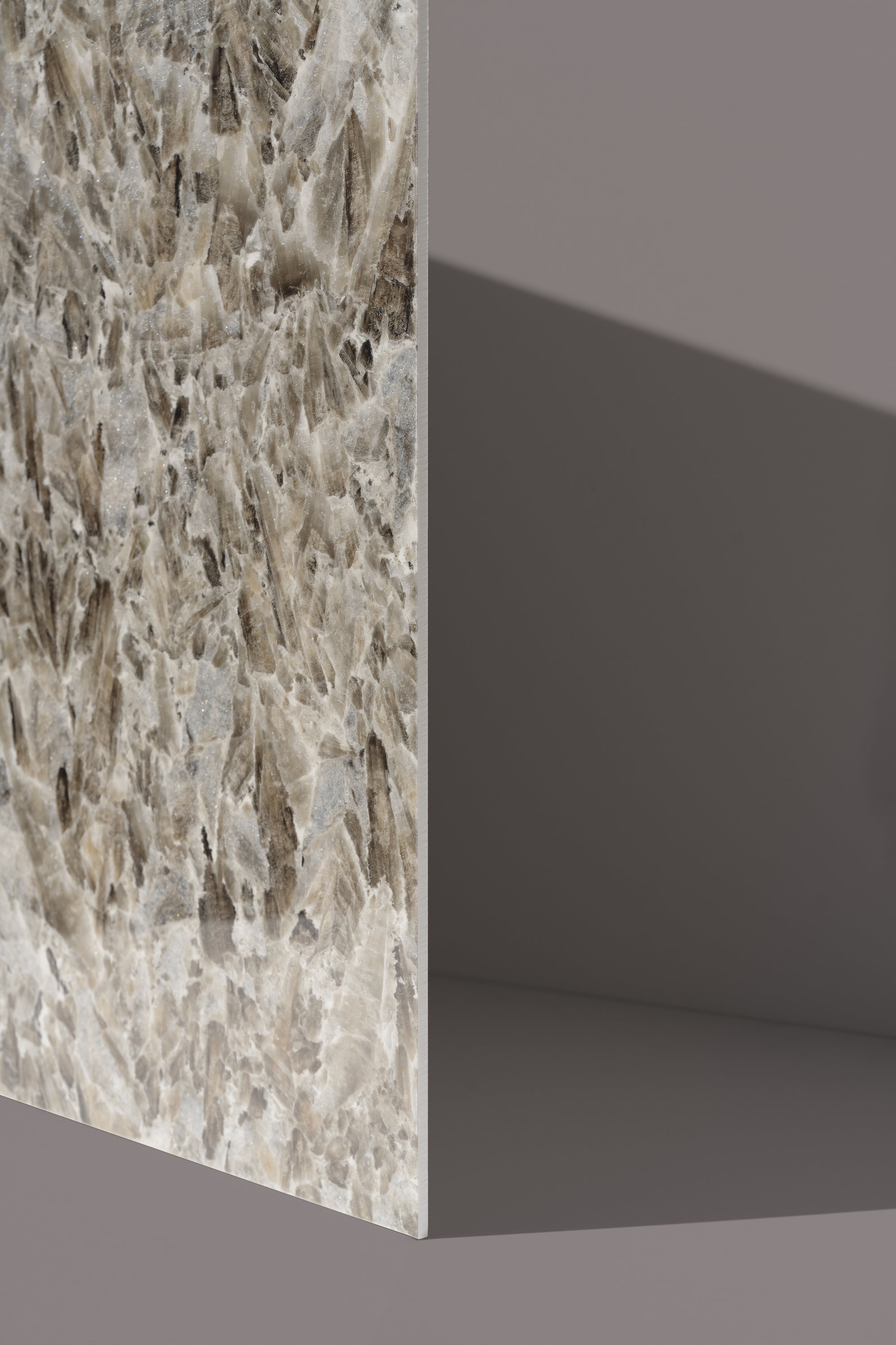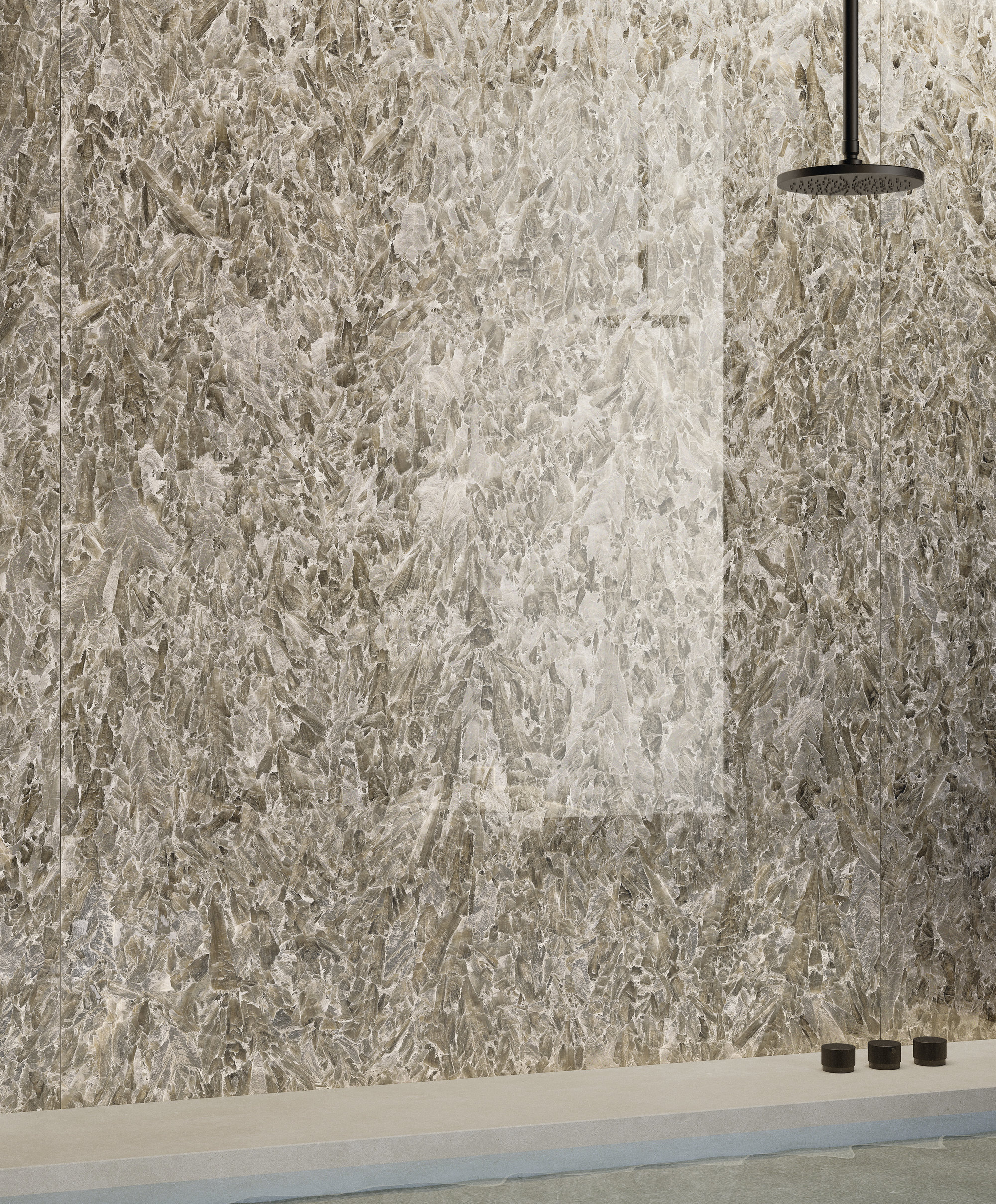 The brilliance of the ceramic material is underlined by chiaroscuro effects and shades of grey to create a warm and welcoming atmosphere. The exclusive Jewel finish adds luxuriant silvery reflections to the surface thanks to the alchemic combination of an iridescent mineral with a glassy material, dissolving light in a crystalline flow that penetrates the openings in the surface.